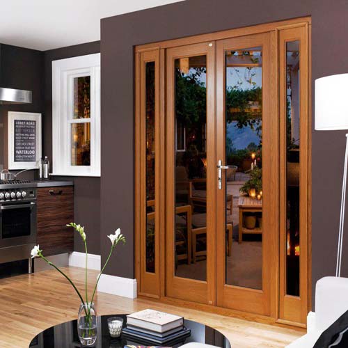 • наличие вставок. Модель бывает полностью глухой либо оснащённой стеклом, расположенным на одном или обоих полотнах. Решения с крупными вставками отвечают характеру гостевых и общественных помещений;