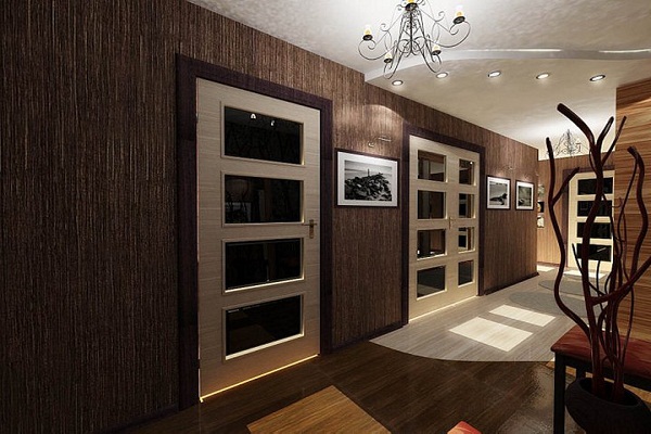 • деревянные, выполненные в виде гладких щитов, которые окрашиваются эмалями широкой палитры или покрываются шпоном. Декор красивых и модных межкомнатных дверей такого типа немногословен - тонкие серебристые линии молдингов, прямоугольные вставки, узкие наличники;
