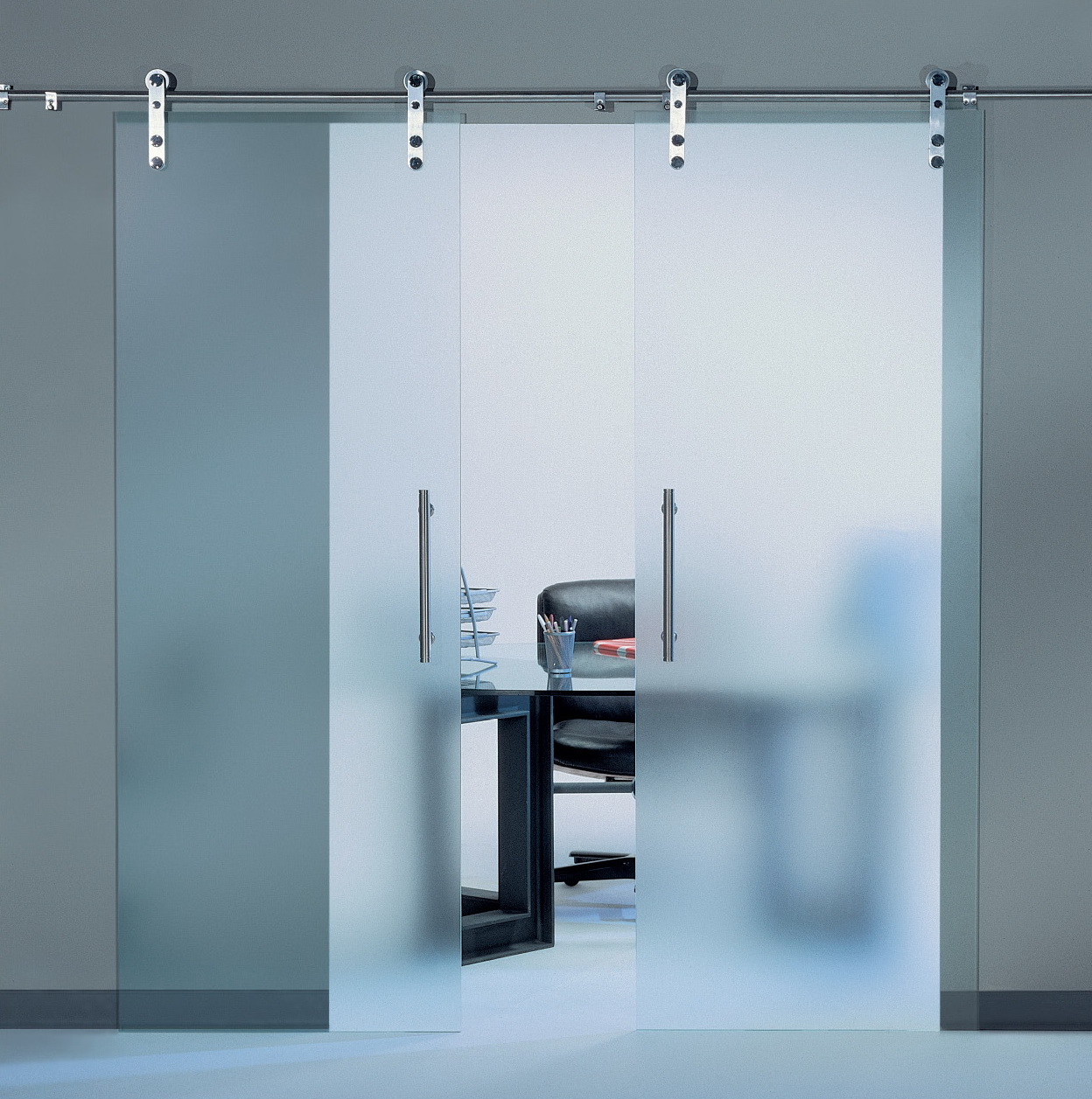 1. металлическая направляющая. Современные заводы предлагают купить откатную стеклянную дверь в наборе с верхним рельсом. Подвесная система кажется особенно лёгкой и презентабельной;